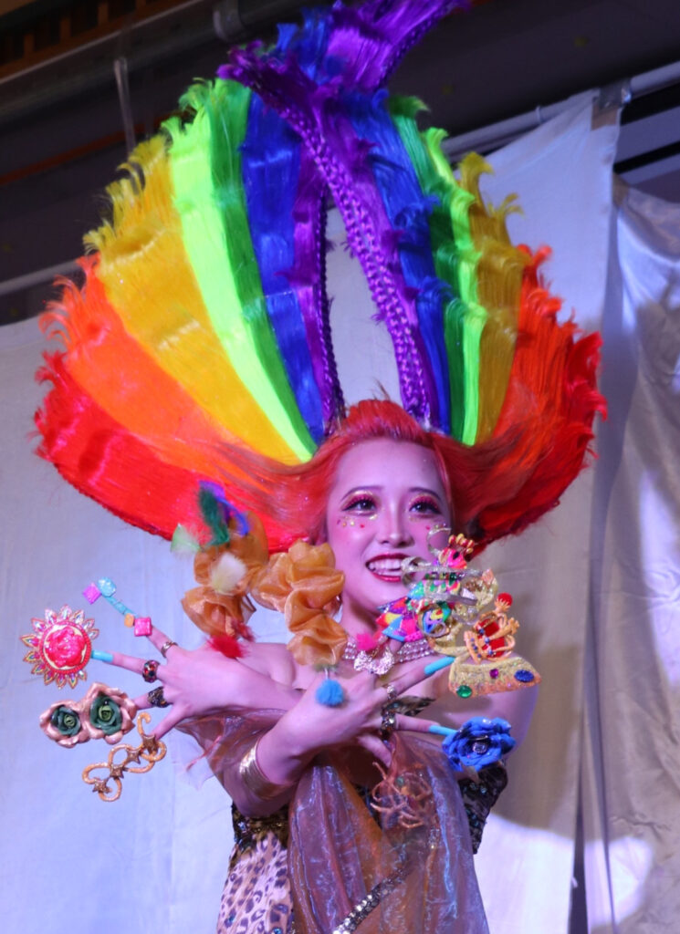 アイムのヘアショーは、制作する過程を全て見て頂く第1部と音楽と共に表現して見せる第2部の、2部構成で成り立っています。作品の大きさは他に類を見ないと言われるほど、評判のショーですが、毎年楽しみにして頂いているイベントでもあります。また、ヘアーだけでなく、ネイル・メイク・衣装・ウォーキング曲の全てが、メインテーマに沿って語られる「コンセプト」に合わせて制作されていて、ご覧頂いている方に「絵物語」を見ているような感じを与える、独特のショーとなっています。